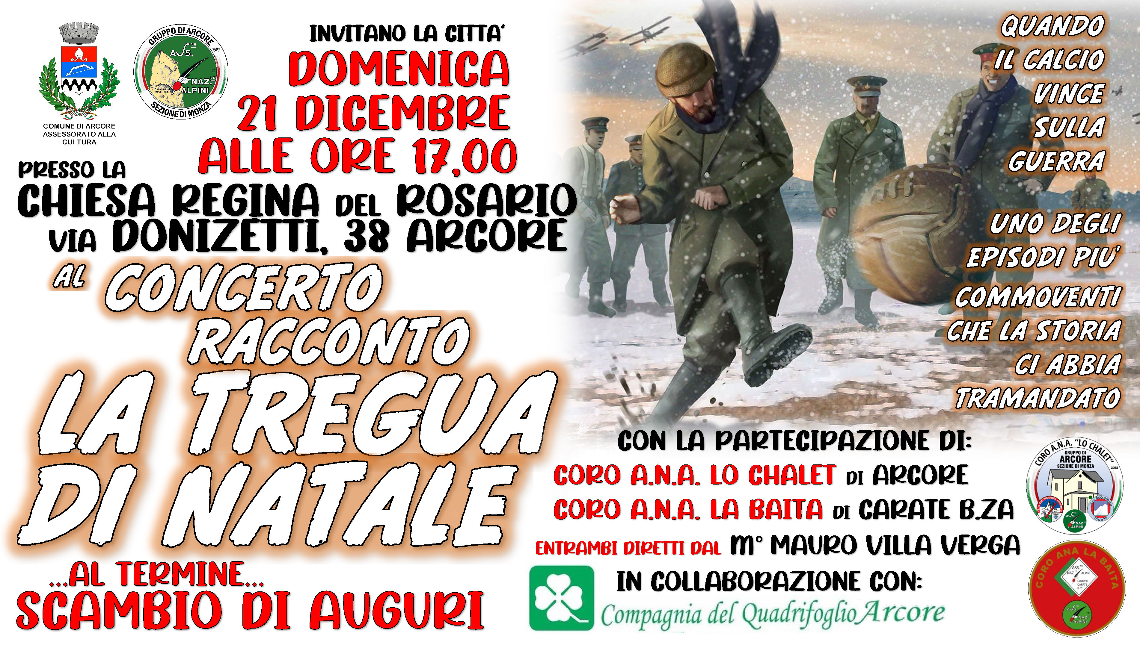 Si racconterà la “Tregua di Natale”, intercalato dai canti del Coro ANA Lo Chalet di Arcore ed il Coro ANA La BAITA di Carate Brianza il 21 dicembre alle ore 17,00 presso la Chiesa Regina del Rosario in Via Donizetti ad Arcore.