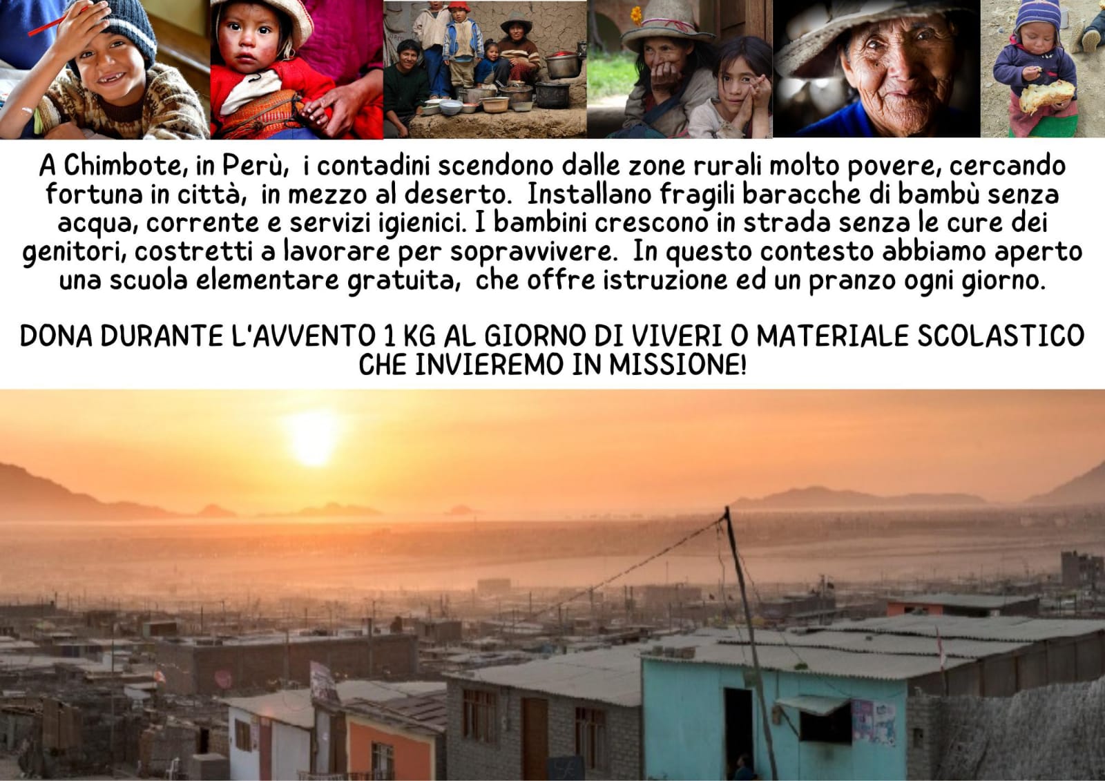 In occasione del periodo di avvento, l'Istituto Comprensivo di Arcore invita tutte le famiglie degli alunni delle Scuole dell'Infanzia e delle Scuole Primarie a partecipare alla raccolta di cibo e le famiglie degli alunni della Scuola Secondaria alla raccolta di materiale scolastico che, come da tradizione, verrà affidato ai volontari dell'Associazione Mato Grosso che a loro volta invieranno alla missione di Chimbote (Perù):