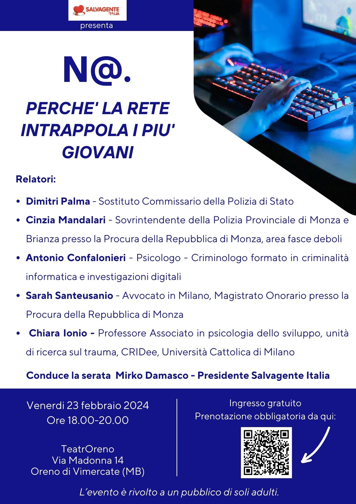 Venerdì 23 febbraio 2024 alle ore 18, presso TeatrOreno di Oreno di Vimercate, si terrà un incontro promosso da Polizia Postale in collaborazione con l'Associazione Salvagente Italia dal titolo Perché la Rete Intrappola i più Giovani.