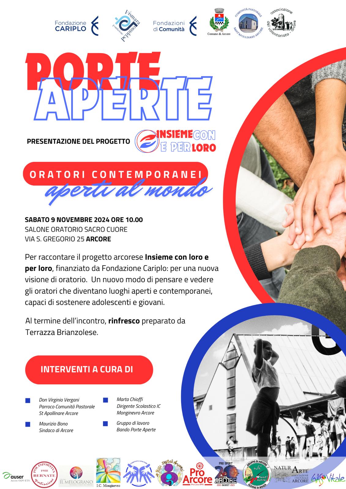 Sabato 9 novembre alle ore 10:00, presso il salone oratorio del Sacro Cuore (via S. Gregorio, 25 - Arcore) verrà presentato il progetto Insieme con Loro e Per Loro.